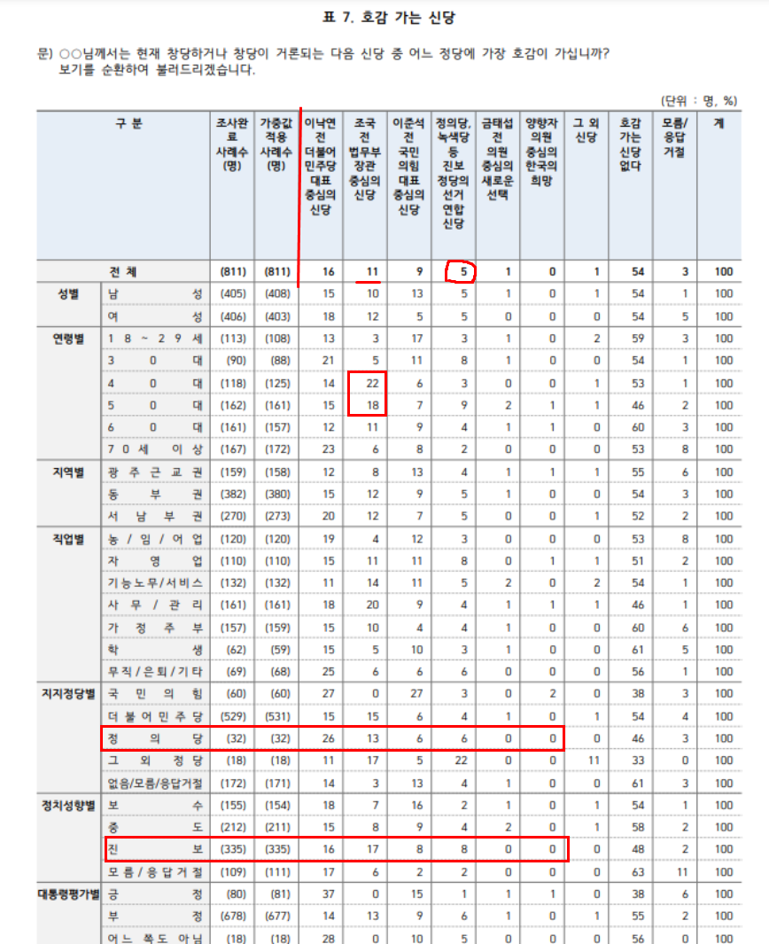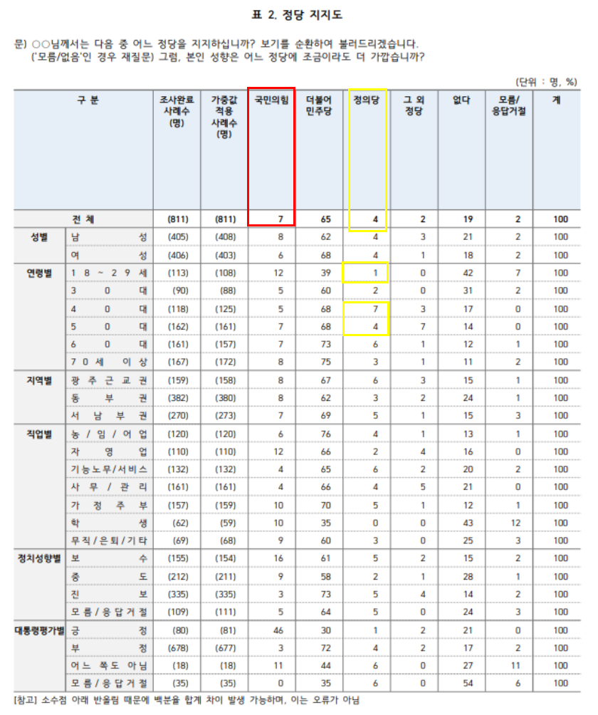 국민의힘 7%, 민주당 65%, 정의당 4%, 없다 19%