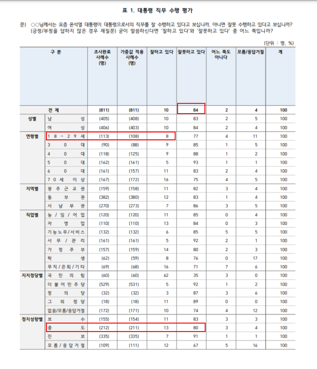 1.윤석열 직무 평가 잘못 (84%) 잘한다(10%)