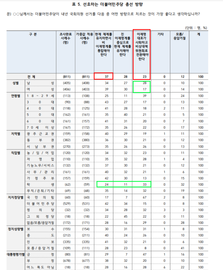 1) 현재대로 + 비-이재명계 통합 37%, 2) 친-이재명 중심으로 28%, 3) 이재명 사퇴와 비대위 23%