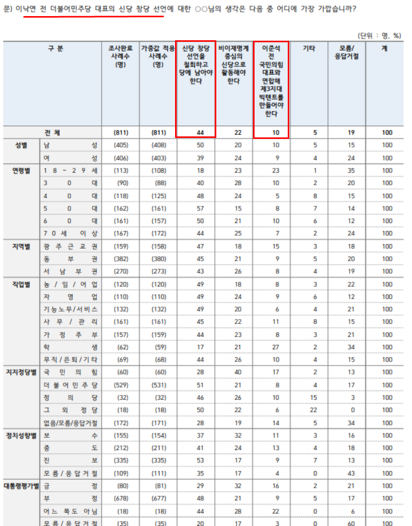 철회해야 하고 민주당 잔류 44, 비이재명계 중심으로 신당 22, 이준석과 빅텐트 10