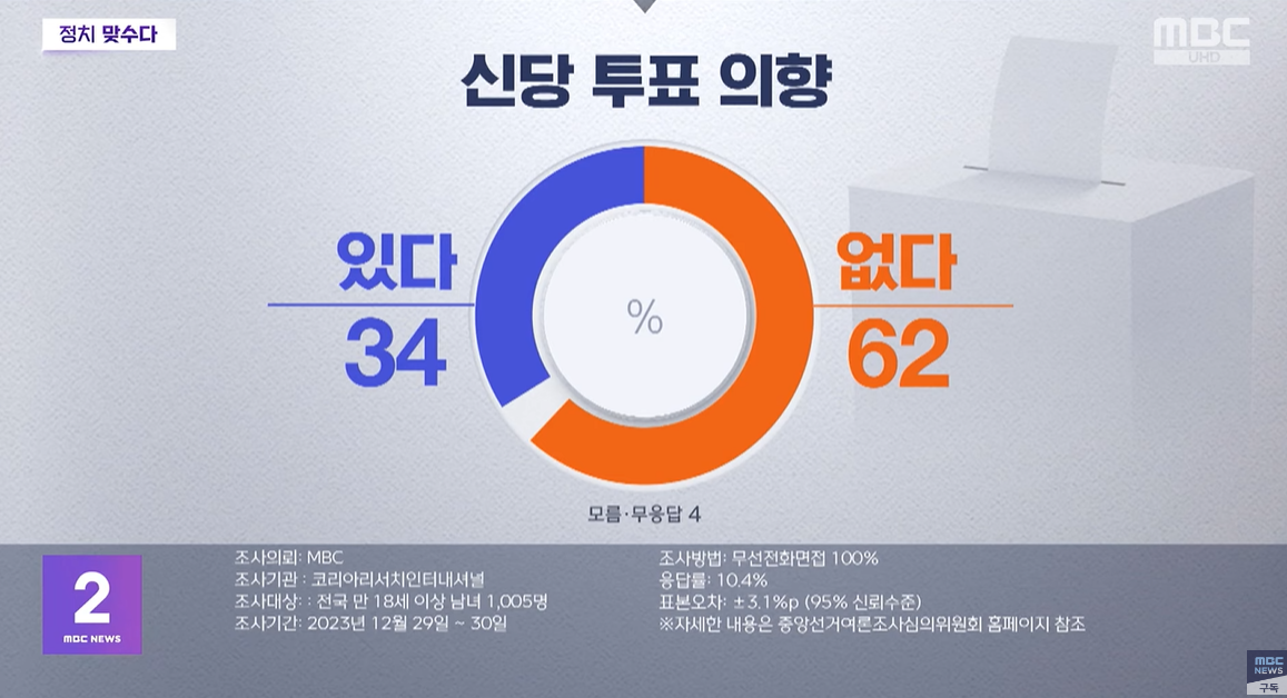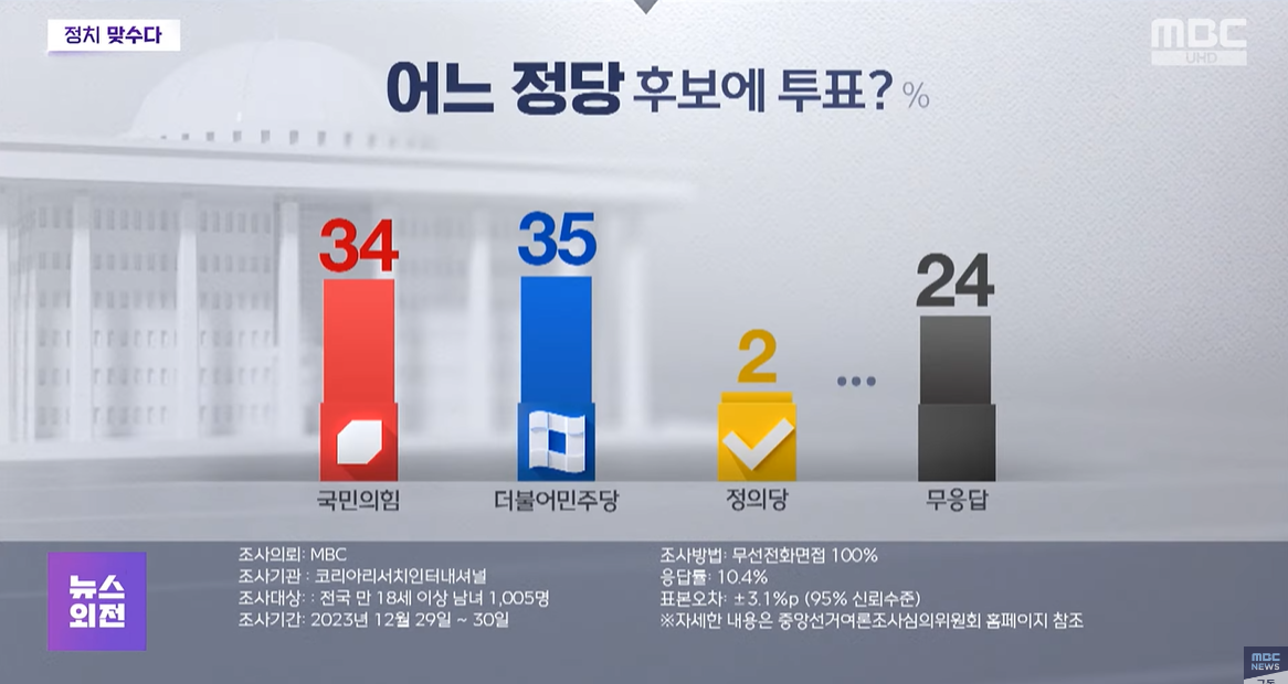 총선에서 어느 정당 후보에 투표하는가? 국민의힘 34%, 민주당 35%, 정의당 2%, 무응답 24%