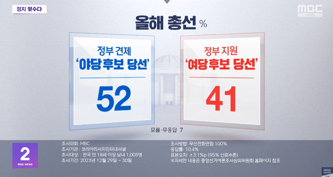 총선 윤석열 정부 견제 야당후보 당선 52%, 정부지원 여당 후보 당선 41%