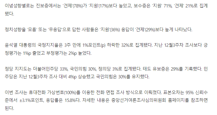 정당 지지도는 더불어민주당 33%, 국민의힘 30%, 정의당 3%로 집계됐다. 태도 유보층은 29%를 기록했다. 민주당은 지난 12월3주차 조사 대비 4%p 상승했고 국민의힘은 30%를 유지했다.