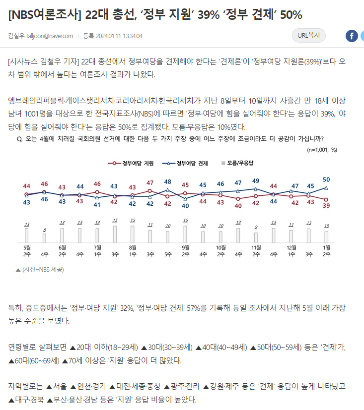 [시사뉴스 김철우 기자] 22대 총선에서 정부여당을 견제해야 한다는 '견제론'이 '정부여당 지원론(39%)'보다 오차 범위 밖에서 높다는 여론조사 결과가 나왔다.