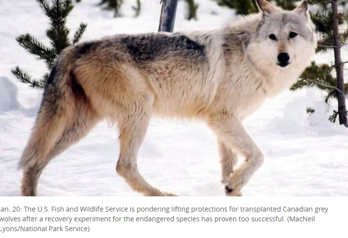 Jan. 20: The U.S. Fish and Wildlife Service is pondering lifting protections for transplanted Canadian grey wolves after a recovery experiment for the endangered species has proven too successful. (MacNeil Lyons/National Park Service)