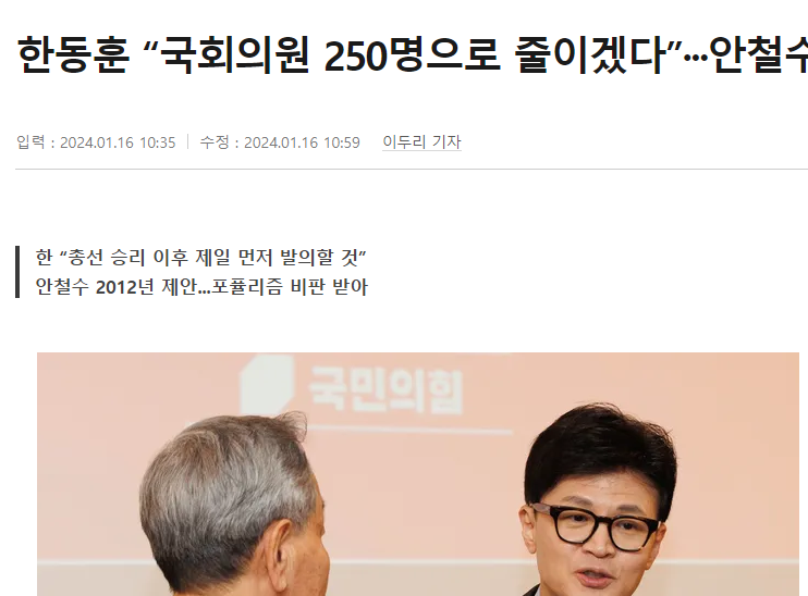 1. 한동훈이 국회의원 250석으로 축소하자고 한 이유는, 현재 국힘이 소수당이기 때문이다. 그리고 '정치는 더럽다'는 케케묵은 주장을 하면서, 반정치를 조장하기 위함이다.