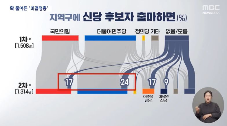 1차 조사에서 '결정 못했다'는 응답자가 그러면 어디로 갔는지 살펴봤더니 41%(민주 24%·국힘 17%)가 기존 거대 양당으로 결집했고, 17%는 이준석 주도의 개혁신당, 9%는 이낙연 신당의 후보를 찍을 것이라고 표심을 새로 정했습니다.