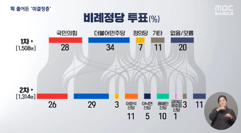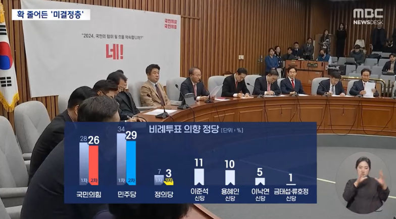 (비례정당 투표 1차 dec 22. 국힘 28, 민주 34, 정의 7, 기타 11, 없음 20)