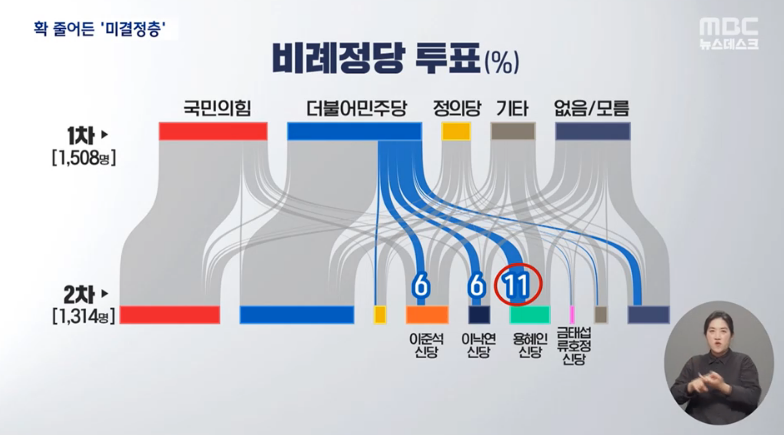 비례대표 민주당 지지층 23% 중, 용혜인(개혁연합신당)으로 11%가 이동, 이준석 신당 6%, 이낙연 신당 6%