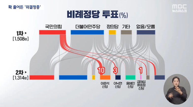 여기에 기존 국민의힘·민주당 지지자의 표심도 움직이면서, 지역구 투표에서 신당을 선택하겠다는 의향은 이준석의 개혁신당 10%, 이낙연 신당 6%로 집계 됐습니다.