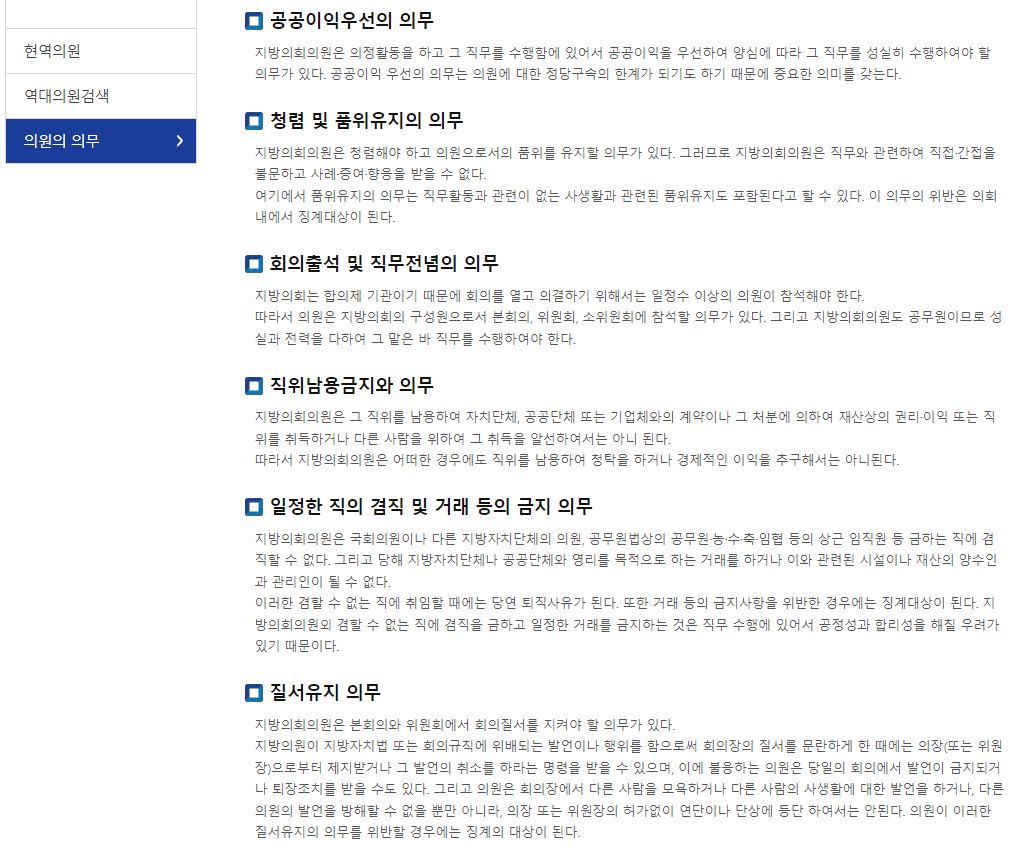 지방의회의원은 본회의와 위원회에서 회의질서를 지켜야 할 의무가 있다.