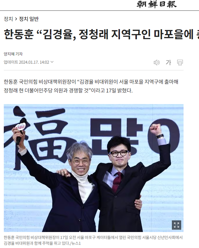 한동훈이 김경율을 국민의힘 마포을 후보라고 한 것은 '낙하산 공천'이다.