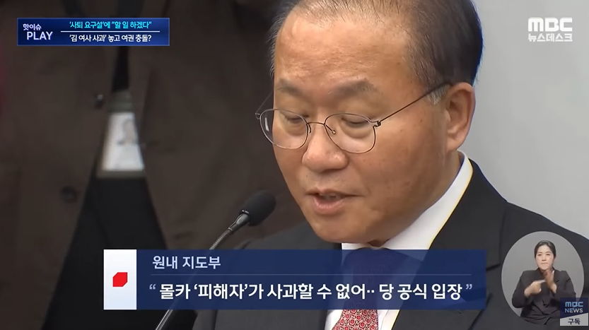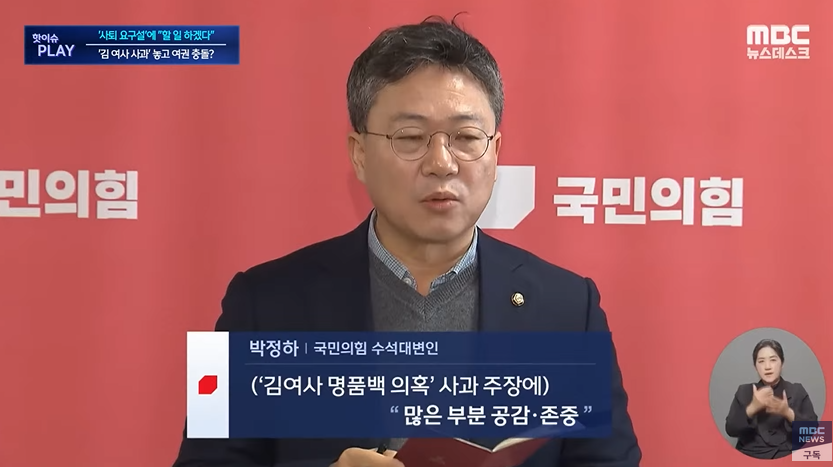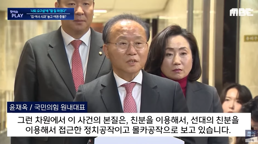 1) 사과와 수사 거부 - 현재 윤석열의 입장임. 윤재옥 (국힘 원내대표) - 김건희 디올백 사건은 정치공작이고 몰카공작이다.