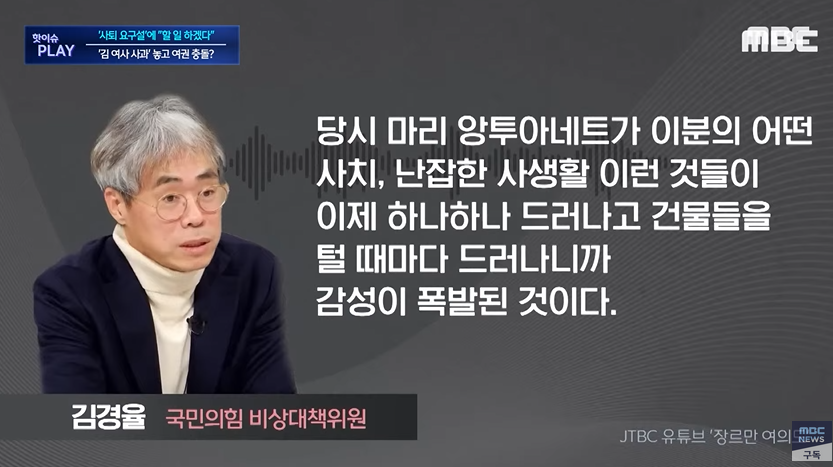 김경율 "(프랑스 혁명) 당시 마리 앙투아네트가 이분의 어떤 사치, 난잡한 사생활, 이런 것들이 이제 하나하나 드러나고 건물들을 털 때마다 드러나니까 감성이 폭발된 것이다" (1월 18일 김경율, jtbc 장르만 여의도.)