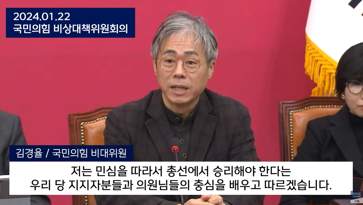 김 비대위원은 이날 당 비대위 회의에서 “좀 더 정제된 모습을 보여드리도록 노력하겠다. 지금까지처럼 오직 민심을 받드는 것, 총선 승리하는 것에만 매진토록 하겠다”며 이같이 밝혔다. 김 비대위원은 또 “얼마 전 제가 대구·경북(TK) 의원들께 분별없는 발언을 했다”며 “이 자리에 계신 윤재옥 원내대표에게 다시 한번 죄송하다는 말씀을 올린다”고 말했다. 김 비대위원은 윤 원내대표 등이 명품 백 수수 논란을 ‘몰카 공작’으로 규정한 데 대해 “TK의 시각”이라고 한 바 있다.