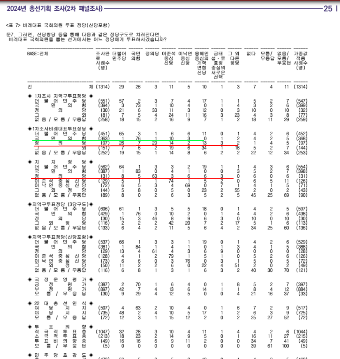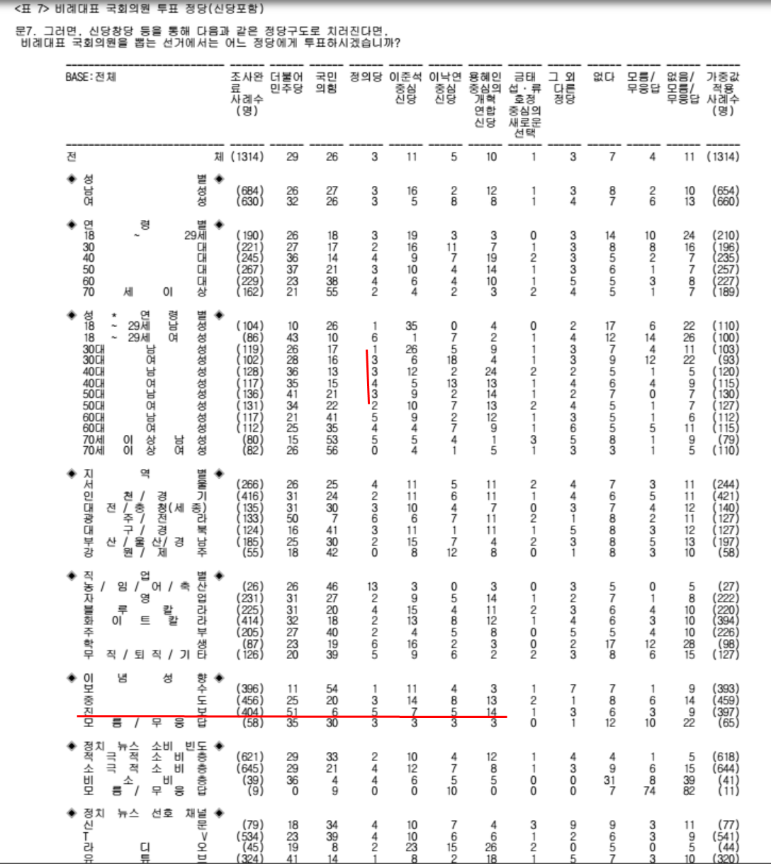 민주 29, 국힘 26, 정의당 3, 이준석 개혁신당 11, 이낙연 5, 개혁연합신당 10, 금태섭 1 그외 3. 없다 7. 무응답 4, 모름 11.