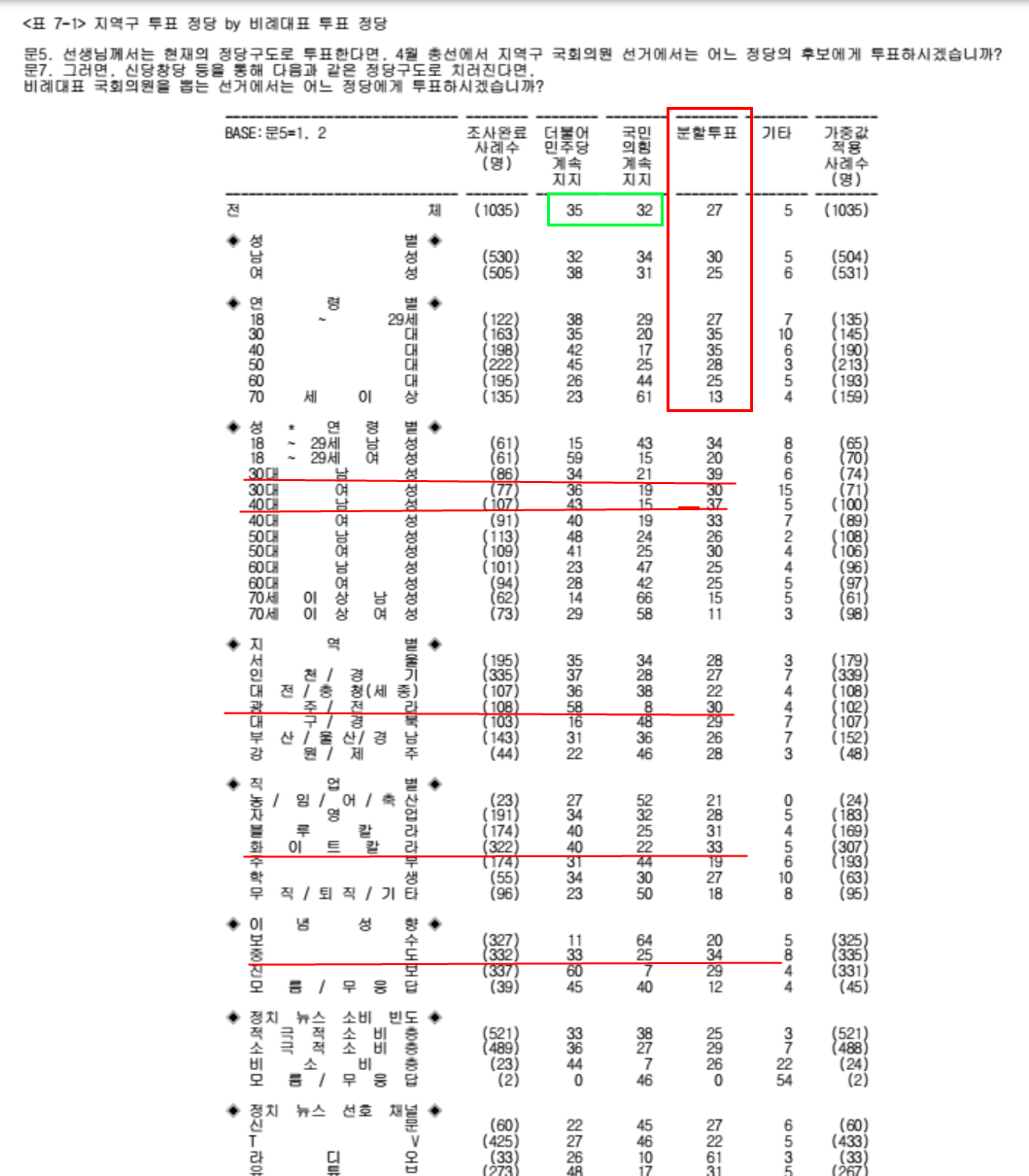문 7. 비례대표 정당 투표. 신당 창당시, 민주당 계속 지지 35, 국민의힘 계속 지지 32, 분할투표 27