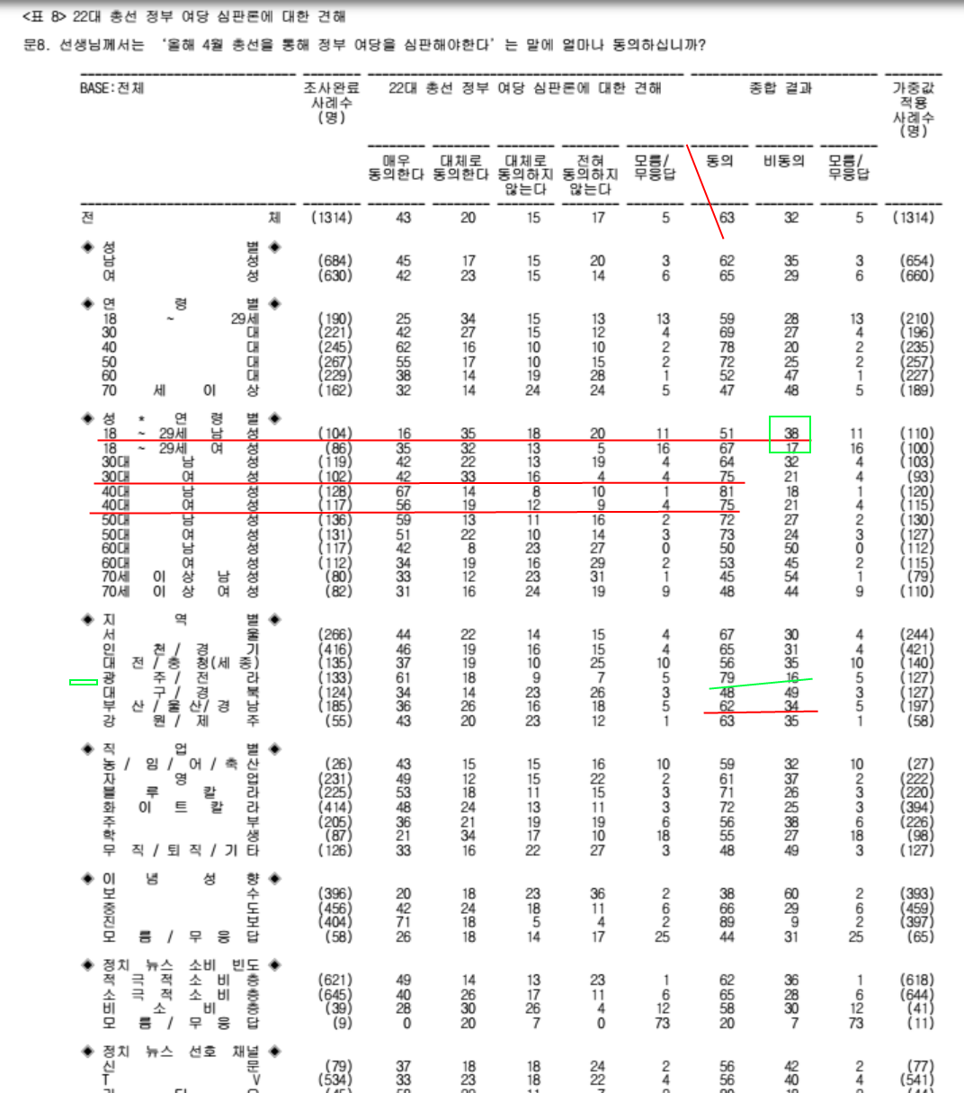문항 8. 총선 구도. 윤석열 정부 심판 동의 63, 비동의 32