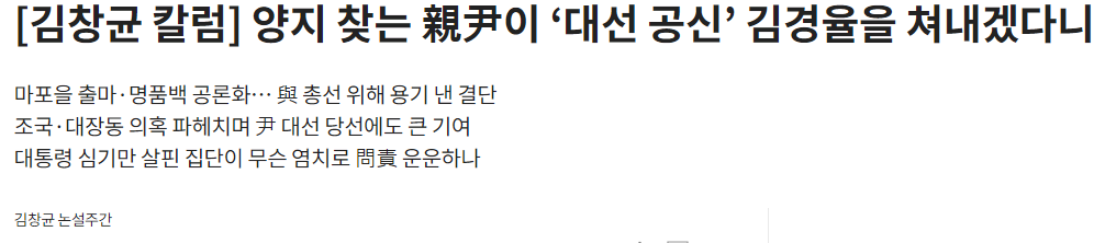 조선일보 김창균은 김경율과 한동훈의 '김건희 리스크' 언급을 옹호하고 나섰다.