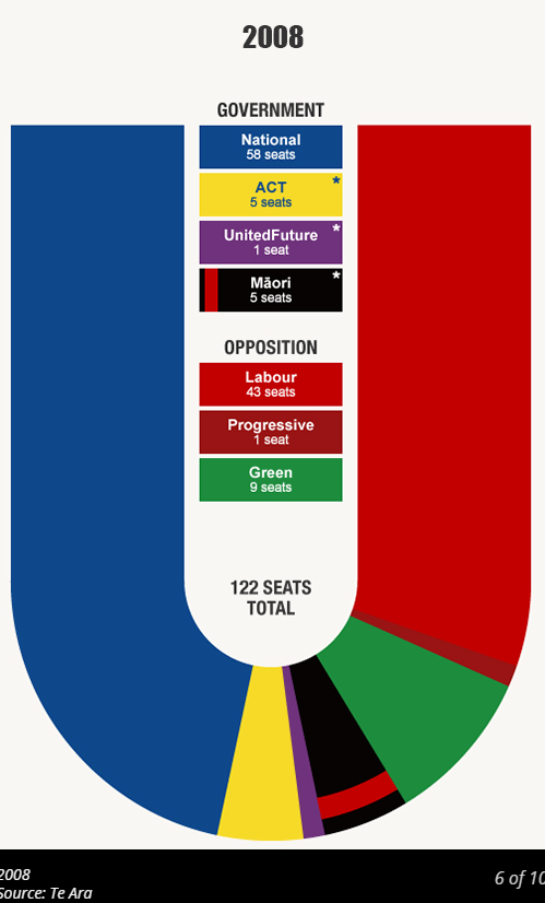 2008년, 국민당 58석 + Act 5석 + 미래연합 1석 + 마오리 5석 = 69석