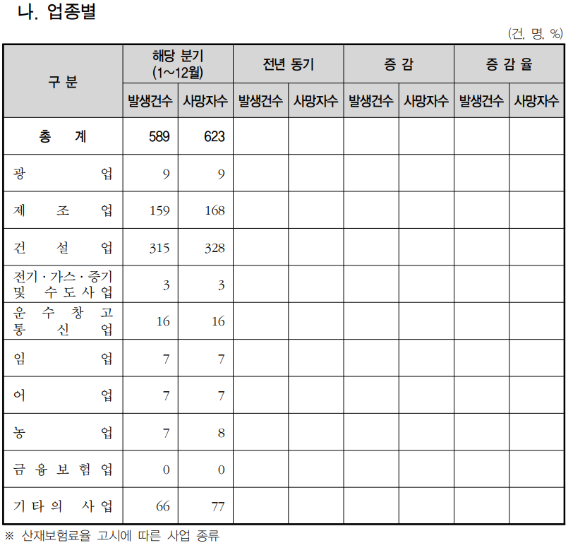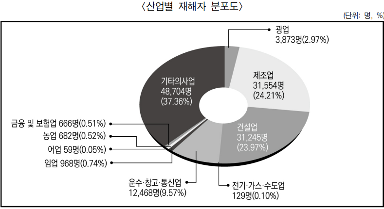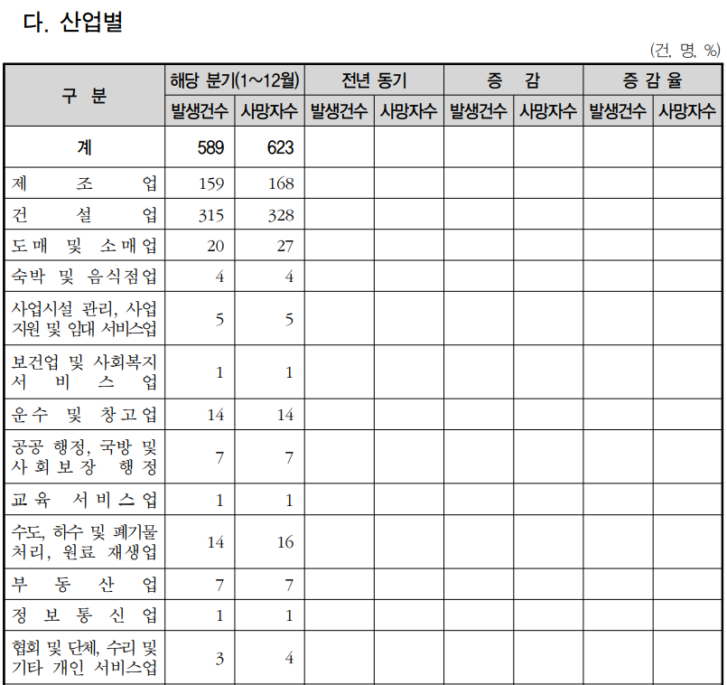 건설업은 341명(328건), 제조업은 171명(163건), 기타업종은 132명(120건) 발생하였고, 업종별 사고사망자 발생 비중은 건설업 53%, 제조업 27%, 기타업종 20%를 차지했다.