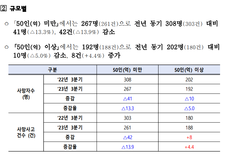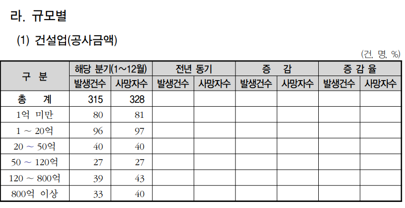 50인(억) 미만에서는 건설업은 226명(224건), 제조업은 82명(82건), 기타업종은 80명(75건) 발생하였고, 건설업 58%, 제조업 21%, 기타업종 21%를 차지했다.