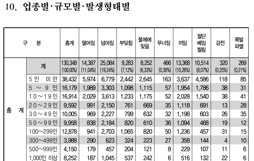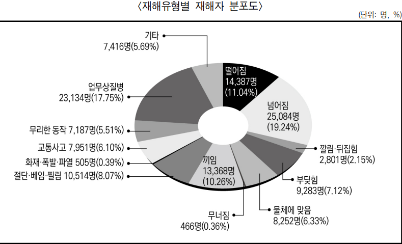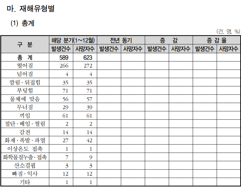 떨어짐 268명(262건), 끼임 90명(90건), 부딪힘 63명(63건) 순으로 상위 3대 유형의 사고사망자 비중이 전체의 65.4%를 차지했다.