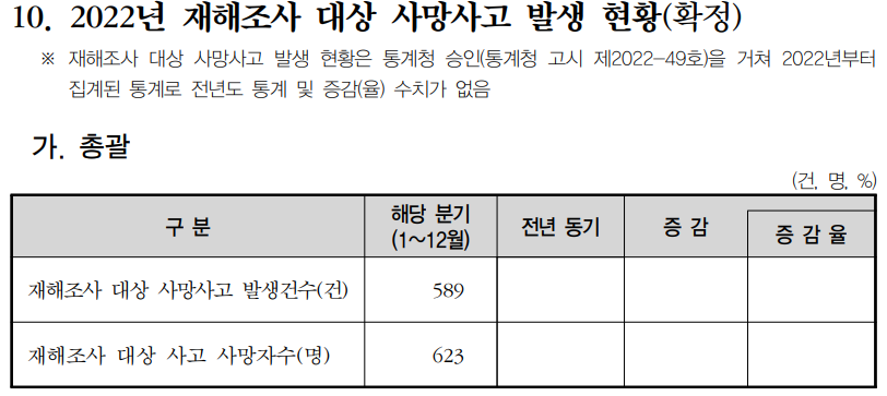 고용노동부(장관 이정식)는 2022년 "재해조사 대상 사망사고 발생 현황" 을 발표했다.