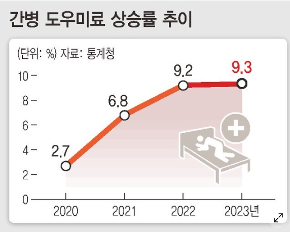 통계청 자료를 보면, 최근 2년 동안 간병비는 전년 대비 9% 이상 오르고 있다. 2019년 3.1%, 2020년 2.7%였던 간병비 상승률이 2021년 6.8%로 급격히 뛰더니 2022년 9.2%, 2023년은 9.3%나 올랐다. 하루 12만~13만원씩 한달이면 400만원가량의 간병비가 든다는 호소가 나오는 까닭이다.