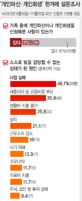 한겨레가 지난해 8월16일부터 석달 동안 33명의 파산관재인을 통해 진행한 128명의 파산 신청자 설문조사에서도 이런 흐름이 뚜렷이 드러났다. 128명의 파산 신청자에게 ‘가족 중에 개인파산이나 개인회생을 신청해본 사람이 있는지’ 물었더니 18%(23명)가 ‘있다’고 답한 것이다.