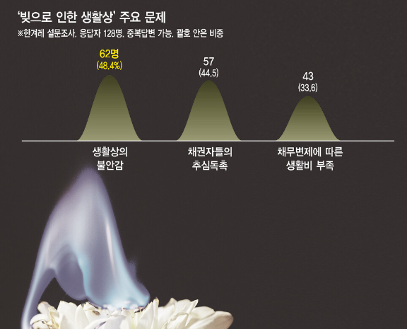 한겨레가 파산 신청자 128명을 대상으로 진행한 설문조사에서도 ‘생활하며 가장 어려웠던 점’을 묻는 질문에 ‘채권자들의 추심독촉’이라고 답한 사람이 44.5%(57명)나 됐다. ‘생활상의 불안감’(48.4%)에 이어 두 번째로 많은 답변이었다.