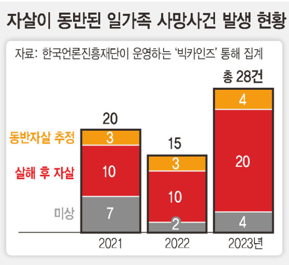 이는 한국 사회에서 낯선 일이 아니다. 한겨레가 한국언론진흥재단이 운영하는 ‘빅카인즈’에 접속해 검색해봤더니, 2명 이상의 가족이 가족 간 살해와 극단적 선택으로 집단 사망한 사건은 2021년부터 3년 동안 모두 63건 발생했다. 사망자는 168명이나 됐다. 63건에는 가족 살해 후 자살이 40건, 동반자살이 10건 포함돼 있었다. 나머지 13건은 살해 후 자살인지 동반자살인지 보도로는 정확히 규명되지 않았다.