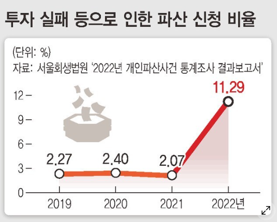 서울회생법원의 ‘2022년 개인파산사건 통계조사 결과보고서’에서도 ‘투자(주식 등) 실패 또는 사기 피해’에 따른 파산 신청자 비율이 2019년부터 2021년까지는 2%대를 유지했으나 2022년에는 11.3%로 급증했다.