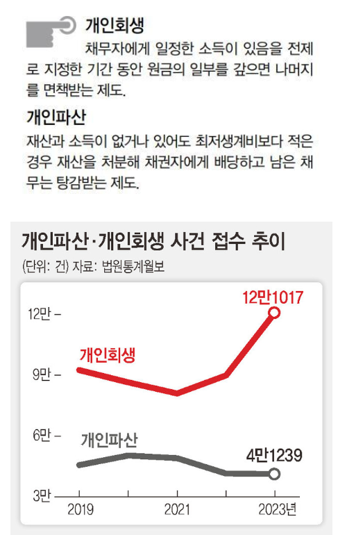 이러자 채무조정 제도를 찾는 사람이 급증하고 있다. 지난해 개인파산 신청 건수는 4만1239건으로 전년(4만1463건)보다 소폭 줄었으나, 개인회생 신청 건수는 12만1017건으로 전년(8만9966건)에 견줘 34.5%나 늘었다. 최근 10년 새 가장 많은 수치다.