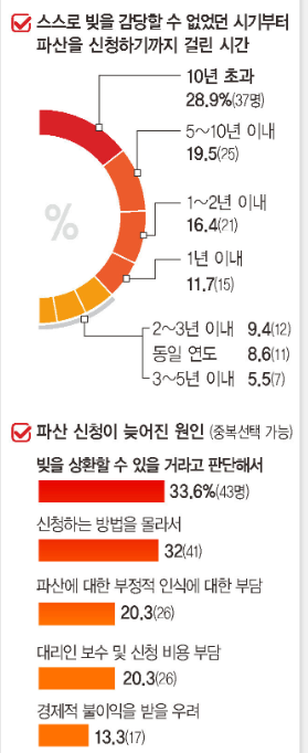 이런 상황임에도 한국의 채무자들은 미루고 미루다 벼랑 끝에 몰려서야 파산이라는 탈출구를 찾아온다. 한겨레 설문조사에서 ‘스스로 빚을 감당할 수 없었던 시기부터 파산을 신청하기까지 걸린 시간’을 묻는 질문에 ‘10년 초과’라는 답변을 한 파산 신청자가 28.9%(37명)로 가장 많았다. ‘5~10년 이내’라는 답변(19.5%·25명)이 두번째로 많았다.