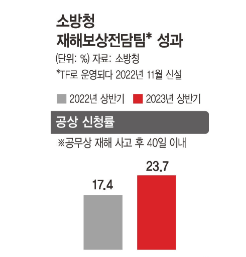 전담팀이 생긴 뒤 공상 업무 처리 속도는 빨라지고 있다. 올 상반기 6개월 동안 소방관에게 사고가 발생한 뒤 40일 이내 공상을 신청한 비율이 23.7%였는데, 이는 지난해 상반기(17.4%)보다 6.3%포인트 증가한 수치다. 공상 신청 접수를 받아 심의회에 심의를 의뢰하는 공무원연금공단이 공상 관련 서류를 보완하라고 요구해 온 비율도 올 상반기 31.1%에 그쳐 지난해 상반기(60%)의 절반가량으로 줄었다.
