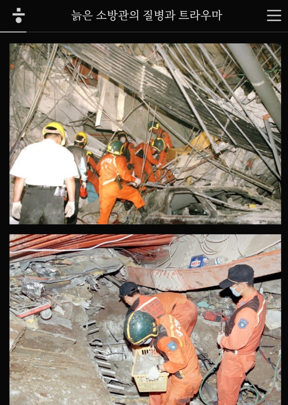 ▶‘소방관, 몸에 새겨진 재난’ 전체 기사를 볼 수 있는 웹페이지는 여기 있습니다 : https://www.hani.co.kr/arti/SERIES/1885/