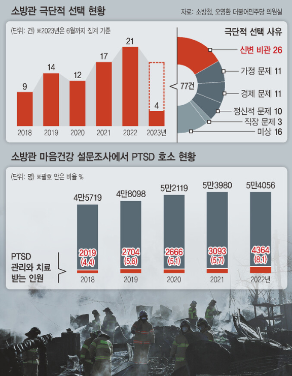 실제로 김향정처럼 정신건강에 문제를 안고 있는 소방관들의 수치는 계속 늘어나는 추세다. 지난해 11월 소방청이 공개한 ‘2022년 소방공무원 마음건강 설문조사’ 결과를 보면, 응답자 5만4056명 가운데 8.1%(4364명)가 피티에스디에 시달리고 있는 것으로 나타났다. 이는 전년도의 5.7%(3093명)보다 2.4%포인트 늘어난 수치다. 우울증을 지닌 소방관도 7.6%(4129명)로 집계됐고, 수면장애가 있는 경우는 29.8%(1만6108명)나 됐다.