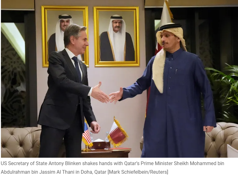 US Secretary of State Antony Blinken shakes hands with Qatar’s Prime Minister Sheikh Mohammed bin Abdulrahman bin Jassim Al Thani in Doha, Qatar [Mark Schiefelbein/Reuters]
