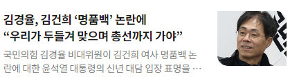 | 일단 꼬리내린 김경율 '디올백 사치품' 침묵, 김건희 주가조작 옹호로 바꿈. 국힘 내부 '사퇴' 주장. (1) | 2024.01.25 |