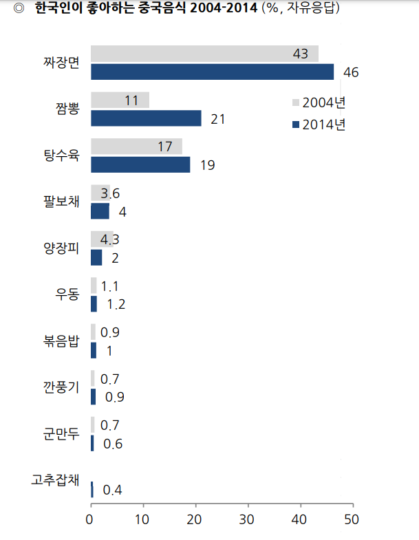 그런데 2004년 조사 때는, 탕수육이 2위, 짬뽕이 3위였으나, 2014년에는 짬뽕이 탕수육을 제쳤다.