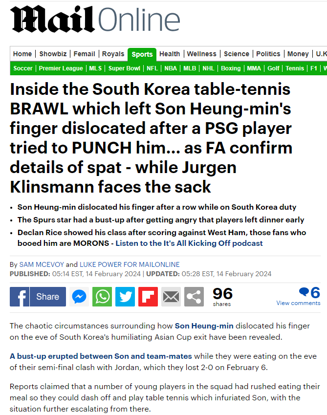 영국 대중지 더선은 14일(한국 시각) “토트넘 스타 손흥민이 아시안컵 준결승 전날 저녁 식사 자리에서 동료들과 언쟁을 벌이다가 손가락 탈구(dislocated) 부상을 입었다”고 보도했다.