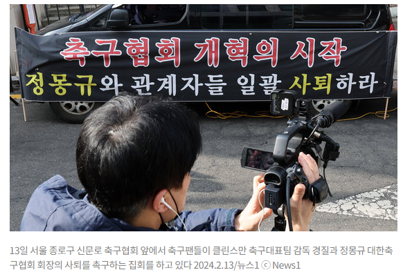13일 서울 종로구 신문로 축구협회 앞에서 축구팬들이 클린스만 축구대표팀 감독 경질과 정몽규 대한축구협회 회장의 사퇴를 촉구하는 집회를 하고 있다 2024.2.13/뉴스1 ⓒ News1