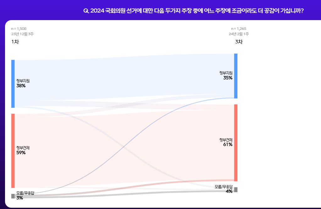 총선 성격 규정 (프레임) 정부 지원 35%, 정부견제 61%. 윤석열 정부에 대한 전 국민적 심판은 실제로 끝났음.