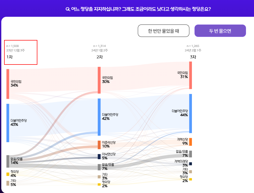 2차에서 용혜인 기소당+사민당은 3차에서 민주당으로 대부분 흡수되어, 민주당이 29%에서 38%로 증가함.