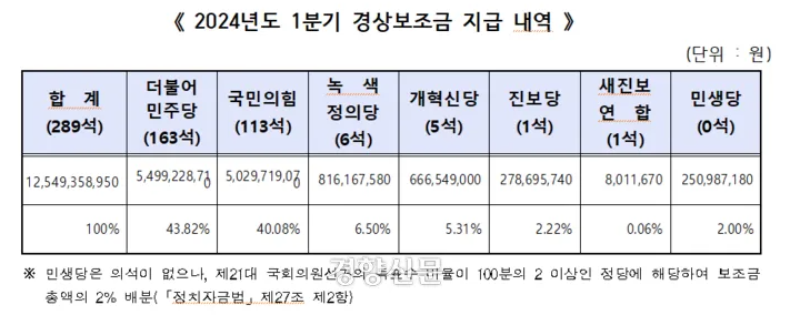경상보조금은 분기마다 각 정당에 지급하는데(올해 125억원가량) 20석 이상 정당(국민의힘·더불어민주당)이 절반을 나눠갖고, 5석 이상~20석 미만(정의당·개혁신당)이 5%, 5석 미만이 직전 총선에서 2% 이상 득표한 경우 등에 2%씩 배분받는다. 4석이었던 개혁신당은 직전 총선 이력이 없어 경상보조금 3천만~4천만원가량으로 예상됐으나, 양 의원 합류로 약 20배 늘어나게 됐다.