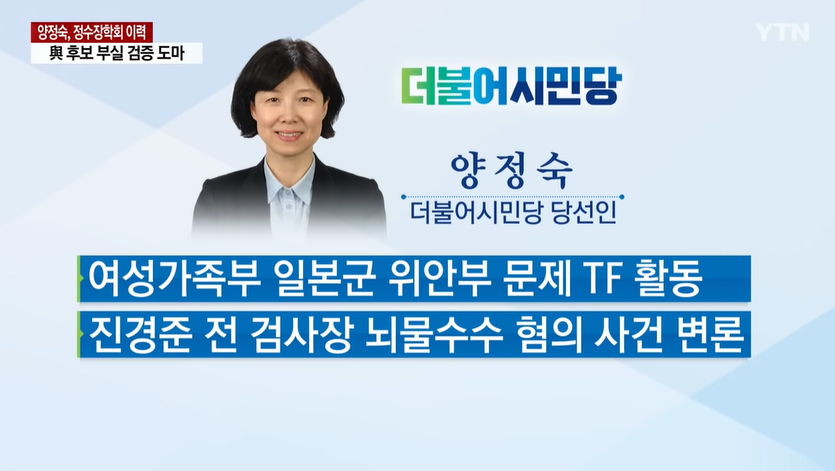 양 당선인은 박근혜 정권 때 만들어진 여성가족부 일본군 위안부 문제 TF에서 활동했고,게임업체 넥슨 대표로부터 회사 주식을 공짜로 넘겨받아 120억 원대 차익을 얻은 혐의로 재판에 넘겨진 진경준 전 검사장을 변론하기도 했습니다.