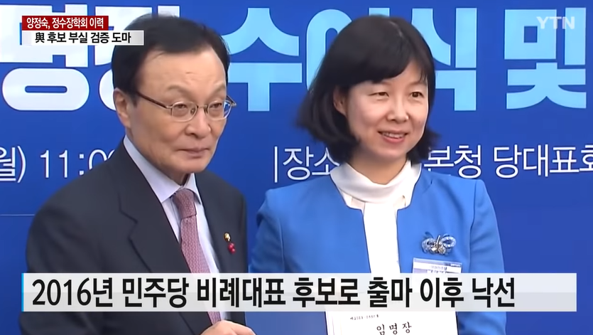 (4) 양정숙 경력 중, 정수장학회 부회장 역임. 민주당이 '더불어시민당' 이라는 위성정당을 졸속으로 만드는 과정에서 인사검증을 하지 못했다고 인정. 국가인권위원회 비상임위원에 임명된지 42일 만에 사퇴하고, '더불어시민당' 비례출마해 논란이 됨.