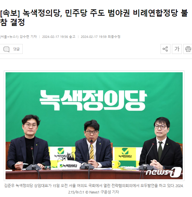 민주당 주도 준위성정당 '비례연합'에 녹색정의당이 불참을 결정했다.