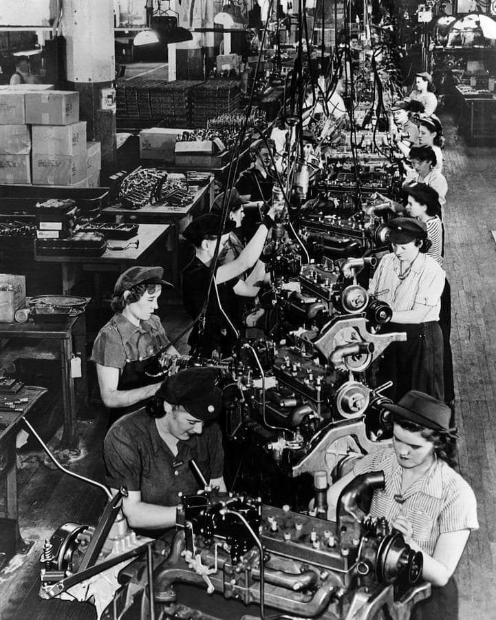 In 1944, women contribute to the wartime effort on the assembly line for Dodge military vehicles, showcasing their vital role in manufacturing during World War II.
